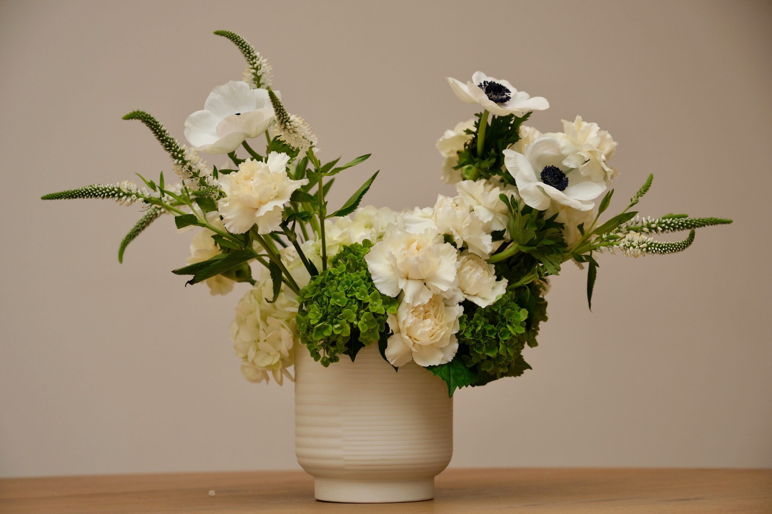 A small flower arrangement in a glass vase with an assortment of spring flowers.